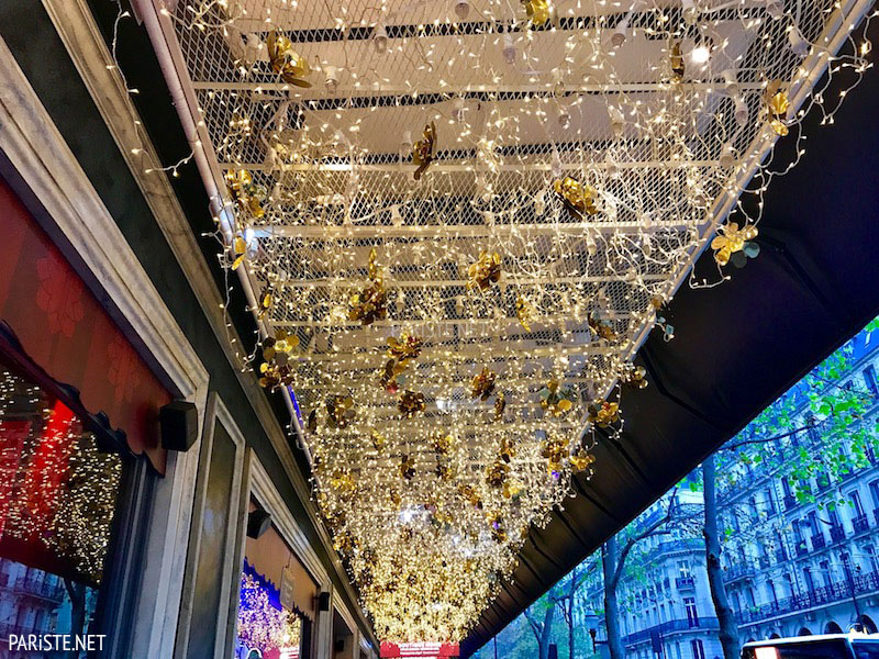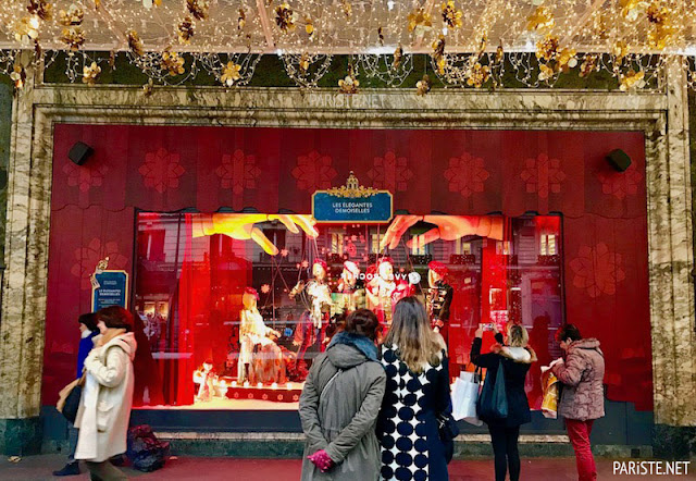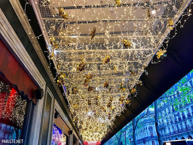Yeni Yıl (ve Noel) için süslenen alışveriş merkezlerini de gezmek keyifli olacaktır. Tabii burada Türkiye'deki AVM'ler gibi (örn: Les Quatre Temps, CNIT vb) alışveriş merkezlerini değil, Galerie Lafayette, Printemps, Le Bon Marché, BHV gibi "çok katlı mağazacılık" hizmeti veren tarihi alışveriş merkezlerini kastediyorum. Bunların vitrini hatta dış cepheleri her Kasım sonu çok keyifli yılbaşı dekorasyonuyla süslenir, vitrinleri daha bir albenili, daha bir oyuncaklı olur. İçlerine girmek istemeseniz bile vitrinlerinin önünden geçmek ruhunuzu şenlendirir diye düşünüyorum. Bu yıl Galerie Lafayette'in vitrinleri bana yavan geldi. Genel konsept olarak kağıt kullanılmış. Sade ve gösterişsiz bir süsleme yapmışlar sanki. "Kadın ve Kozmetik" bölümüne, yani asıl tarihi binasına girdiğinizde göreceğiniz, kapak fotoğrafında da kullandığım dev ağacı da kağıttan yapmışlar bu yıl. Evet şık ama fazla cicili bicili değil sanki ne dersiniz?